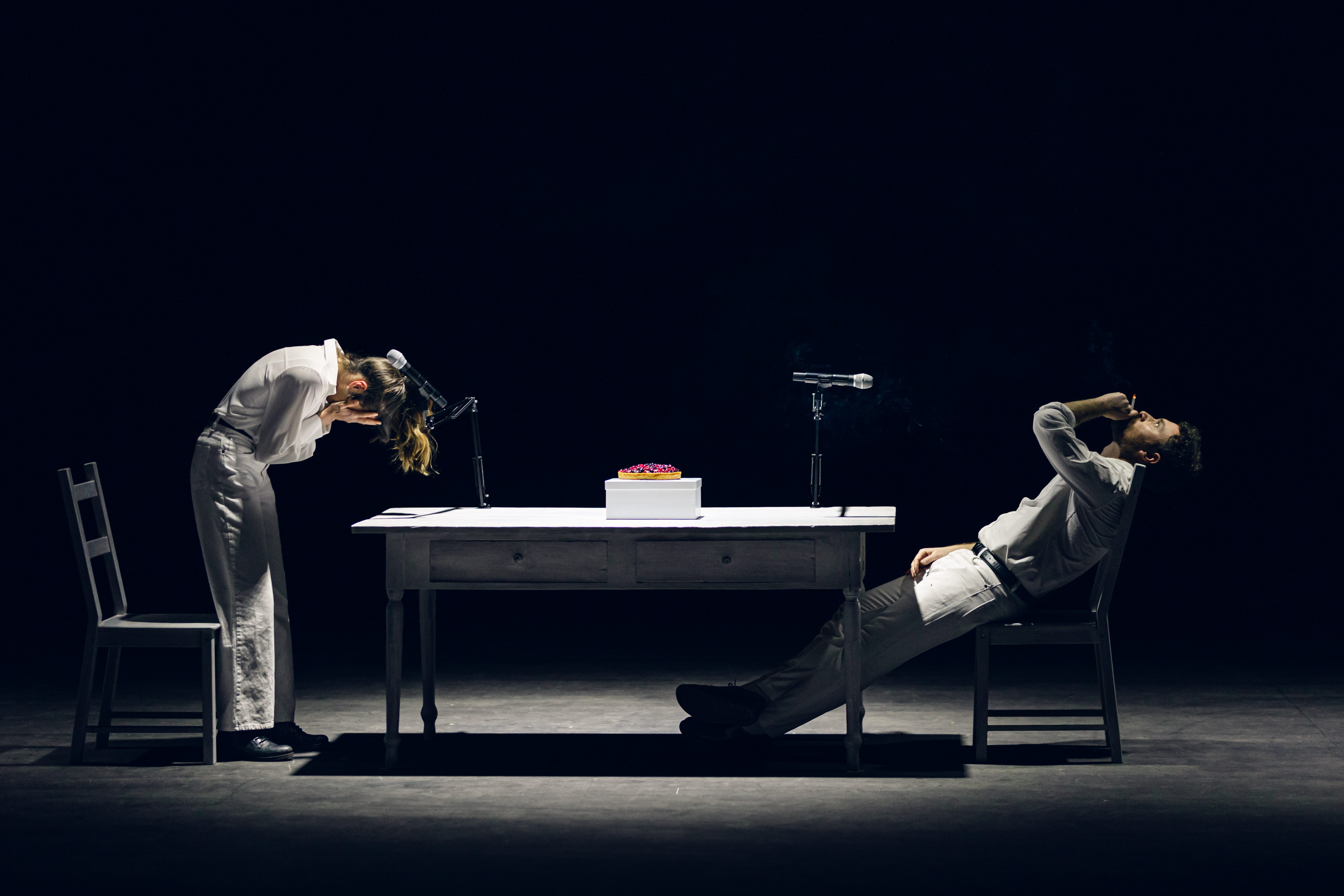 La memoria rappresenta da sempre, nella percezione comune, uno dei tratti distintivi dell’essere umano. La nostra identità in perenne costruzione e mutamento si poggia infatti su un continuo processo di rievocazione, riformulazione o cancellazione del passato. La sua struttura ci rende ciò che siamo nel tempo, nel nostro essere qui e ora, in balia di un movimento altalenante tra ricordo e dimenticanza. Una sommersione continua di persone, oggetti e sentimenti. A raccontare in scena questa fragilità nel nostro rapporto col passato è una coppia, Lui e Lei, unita (e separata) da un tavolo con al centro una torta. Due persone che si parlano, guardano, giocano, duepersone che si scontrano e riappacificano su un palcoscenico in cui il tempo si liquefa ed è difficile distinguere tra il piano reale del presente, quello del ricordo e quello della semplice immaginazione. Chi sta parlando a chi? Quello che stiamo vedendo accade realmente o è il tentativo di ricordare (o dimenticare) qualcosa?