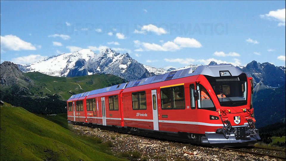 In allegato ; rendering con elettromotrice "Allegra" della Ferrovia Retica ai piedi del Gran Vernel a Canazei nell'ottica del collegamento tra Engadina e le Dolomiti.