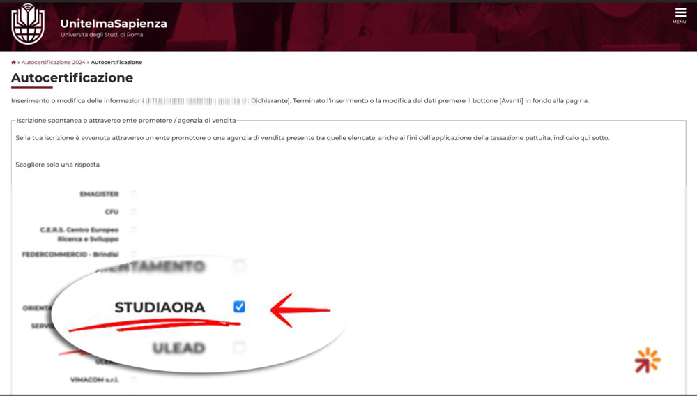 Fare correttamente l'autocertificazione su UnitelmaSapienza sarà fondamentale per accedere ai prezzi ufficiali dell'Università comprensivi di agevolazioni e convenzioni ove applicabili. Quindi, sarà fondamentale in questa fase, selezionare STUDIAORA per ricevere il bollettino da pagare senza costi aggiuntivi. Ecco uno screen che mostra come e dove selezionare STUDIAORA: